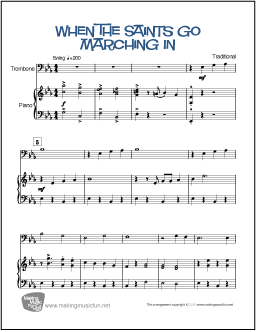 A beginner trombone arrangement of When the Saints Go Marching In with piano accompaniment. Permission granted for instruction, public performance, or just for fun.