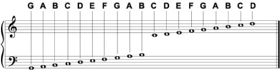The notes in the TREBLE CLEF (G Clef) are the middle and high notes. The purpose of this clef is to show where "G" is positioned on the staff. (The "G" line is the second line from the bottom, where the treble clef gets all swirly.)