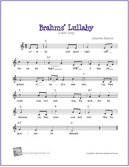 Free printable sheet music for voice, guitar, and piano for Brahms' Lullaby by Johannes Brahms. Lead sheet with music, lyrics, and chords. Permission granted for instruction, public performance, or just for fun.