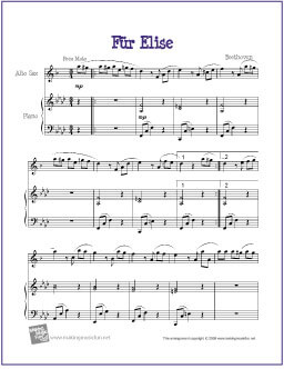 Free printable sheet music for Für Elise by Ludwig van Beethoven for Easy Alto Saxophone Solo with Piano Accompaniment. Permission granted for instruction, public performance, or just for fun.