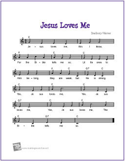 Free printable sheet music for voice, guitar, and piano for Jesus Loves Me. Lead sheet with music, lyrics, and chords. Permission granted for instruction, public performance, or just for fun.