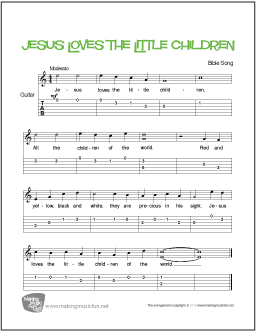 Free printable sheet music for Jesus Loves the Little Children for Beginner Guitar Solo. Digital download includes arrangement in notation and guitar tab. (1 Page)