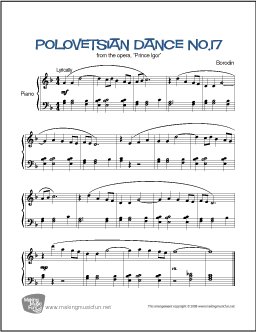 Free printable sheet music for Polovetsian Dance No.17 from Prince Igor by Alexander Borodin for Easy/Level 3 Piano Solo. Permission granted for instruction, public performance, or just for fun.