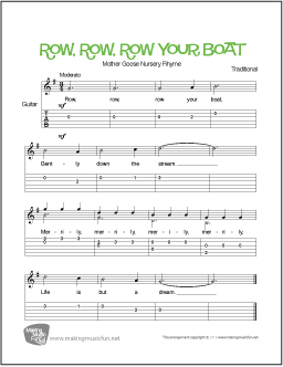Free printable sheet music for Row, Row, Row Your Boat (Mother Goose Nursery Rhyme) for Beginner Guitar Solo. Digital download includes arrangement in notation and guitar tab. (1 Page)