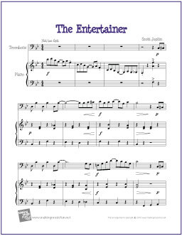 Free printable sheet music for The Entertainer by Scott Joplin for Easy Trombone Solo with Piano Accompaniment. Permission granted for instruction, public performance, or just for fun.
